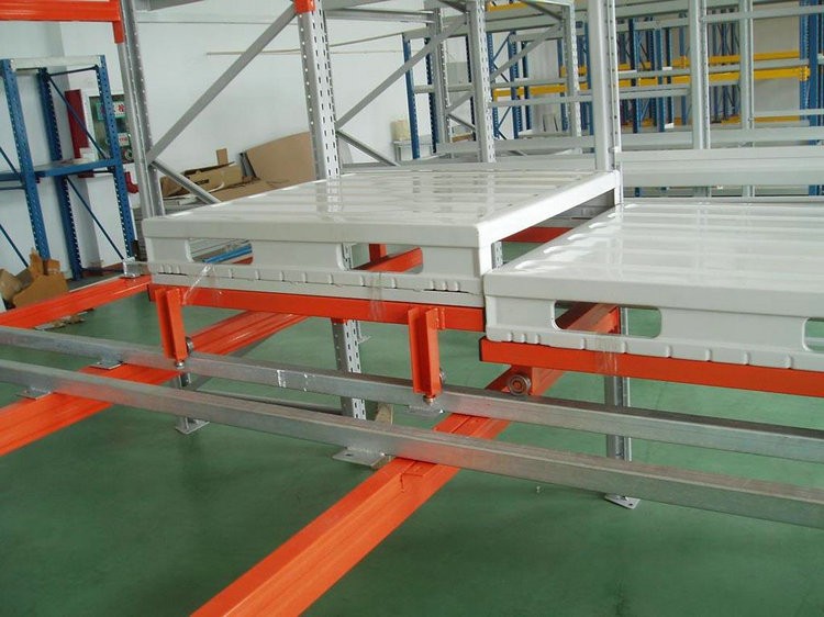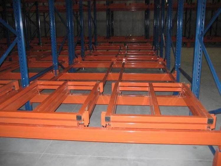 壓入式貨架 1、壓入式貨架是由托盤小車等典型結構件組成,托盤車具有可流動特性,貨物被規定于貨架的一端進出,并遵循先進后出順序。 2、儲運貨物時叉車只位于貨架通道水平較低的一端作業,無需進入貨架貨物存儲通道。此類貨架具有存儲密度高,儲運速度快的典型特征。 3、通常用于存儲場地極其有限,但必須增加存儲容量或對貨物有時間要求等對貨物揀選要求不高的場合使用。